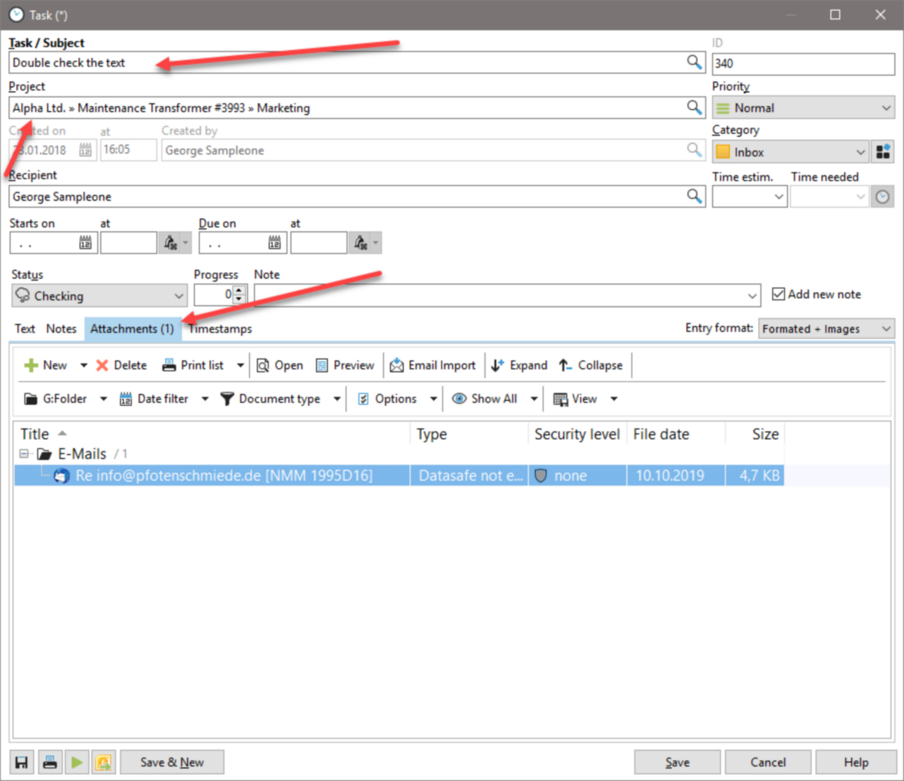 The moment you drag and drop an email onto the task list, the "New Task" dialog opens. There you will see that the email has been assigned to a project and the subject of the email now appears as the task subject. In addition, the email is saved as an .msg file in the data safe and thus in the document management system.
