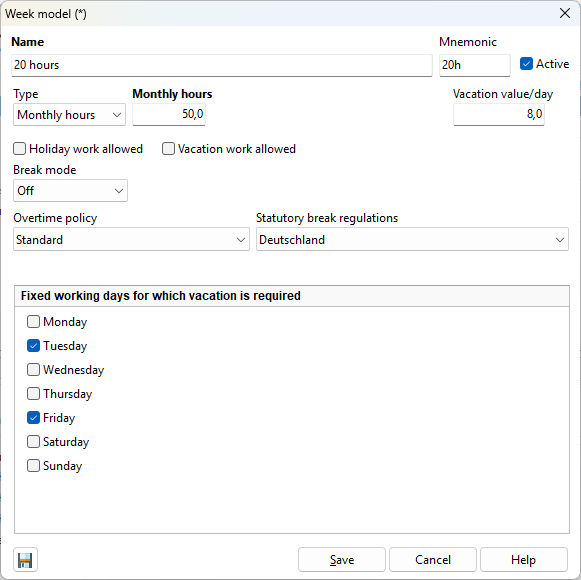 Assign a meaningful name, such as “24 hours part-time”. The working time model consists of the different daily models. If you do not have a suitable daily model to choose from, you can create a new daily model using the “Plus” icon.
