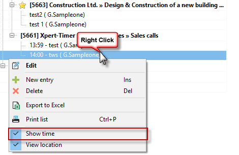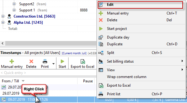 If you click in the activity history or timestamp area, a context menu will appear, allowing you to edit, delete, or print the entries. The content of this menu varies depending on the area, but it is available in almost all places. So feel free to right-click often in Xpert-Timer.