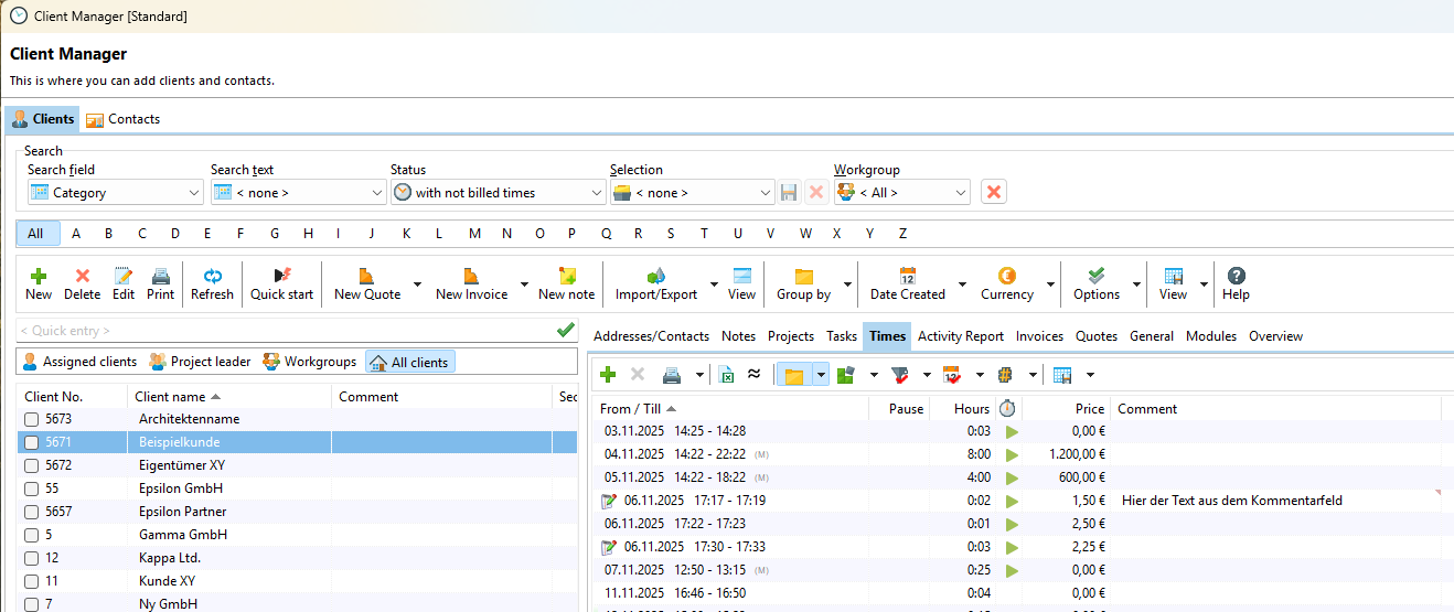 In the "Times" tab, you can see the timestamps for your customer's projects. You can open a context menu by right-clicking on the timestamp list and access additional functions.