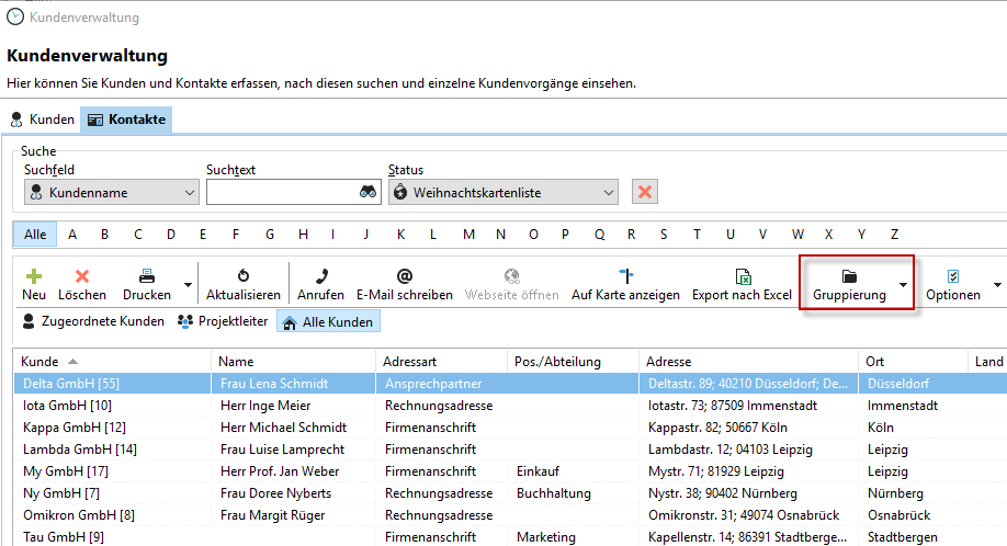 The contact list offers you a wide range of options for grouping and filtering your list. For example, you can create a list of contacts who should receive a Christmas card.
