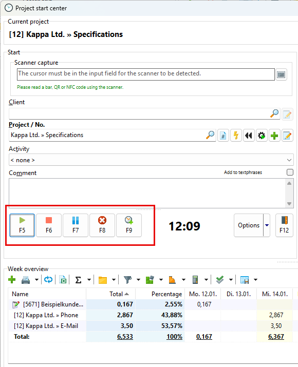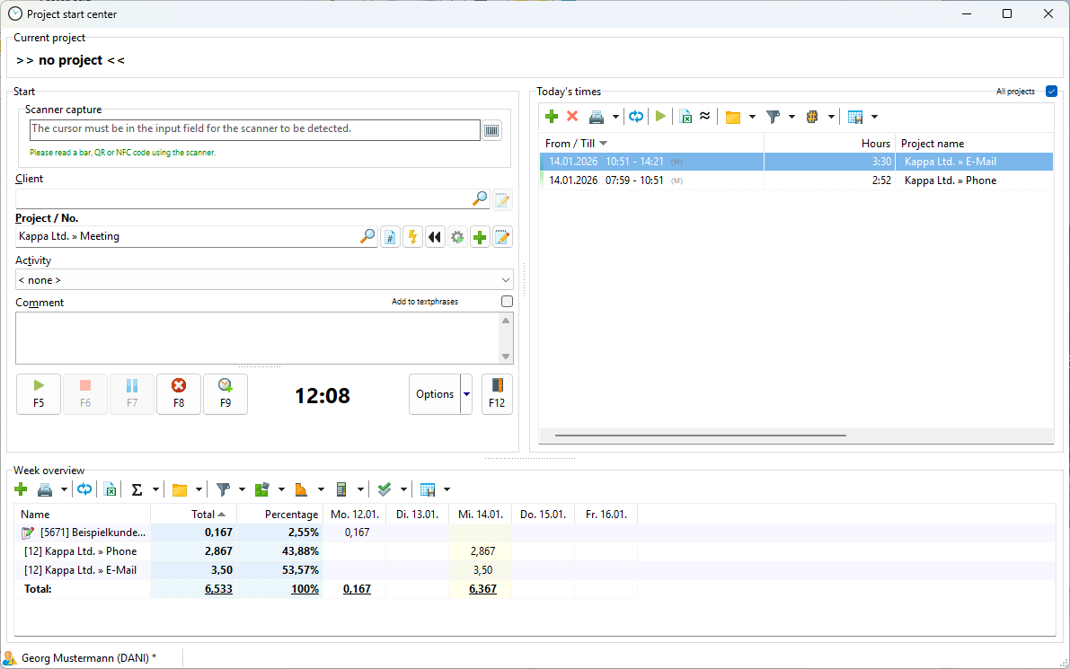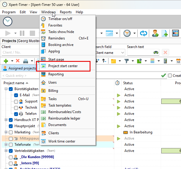 The Project Start Center offers a convenient, fast way to enter project times. So if you are looking for an alternative to the timeline, this is the right place for you. Optionally, you can also display the recorded daily and weekly times to keep track of your total working time. You can also quickly and easily edit and add to the timestamp comment here.