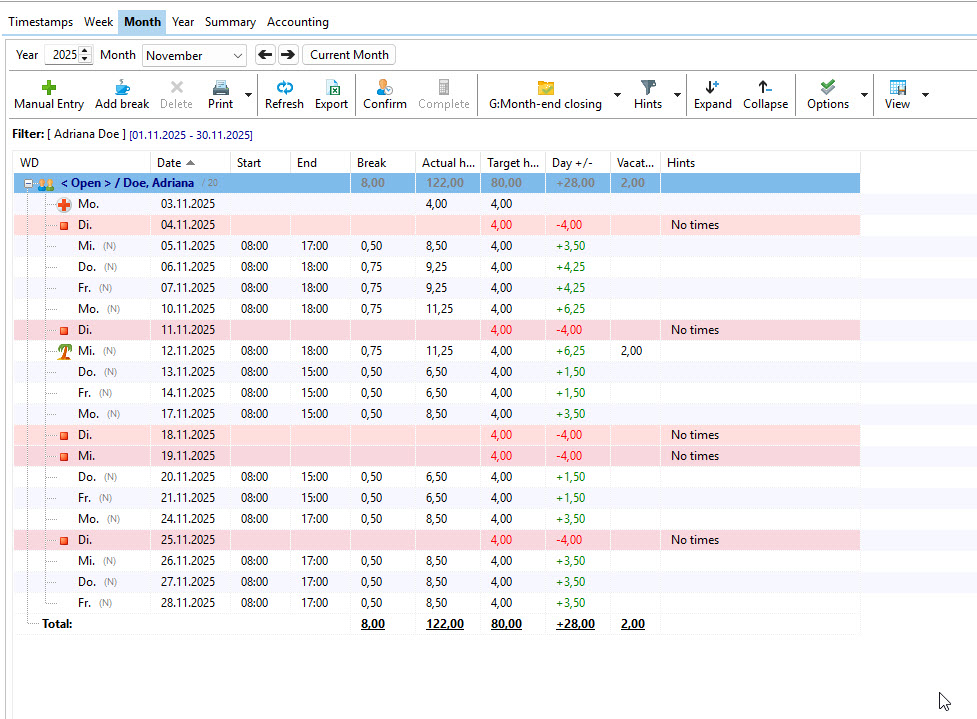 After importing project times, all workdays with project entries are populated. Days without recorded times are highlighted in red and should be reviewed.