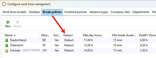 3. If no break times are recorded in Project Time Tracking, you can configure automatic deduction of statutory breaks in the break rules. Please note that this is not legally compliant, as deducting time only assumes that a break was taken.