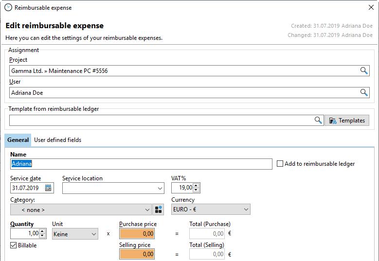 Double-clicking on a reimbursable opens the "Edit reimbursable expense" dialog box, where you can make changes.