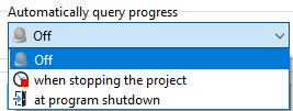 You can also set the automatic progress query in the project properties of the respective project in the "General" tab. The "Automatic progress query" option allows you to automatically activate the project progress query when you stop the time measurement for a project or exit Xpert-Timer.