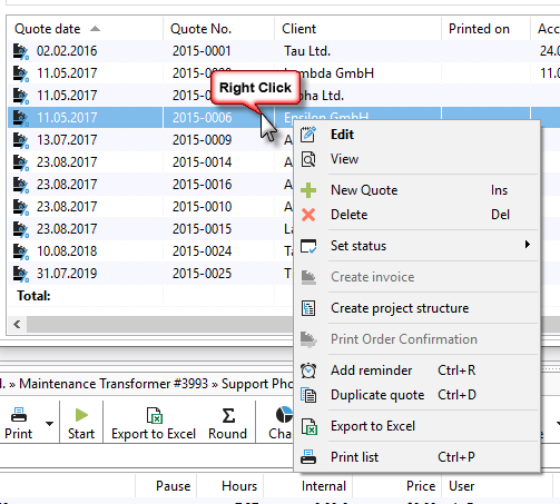 Right-clicking on a quote gives you access to many direct functions as usual.