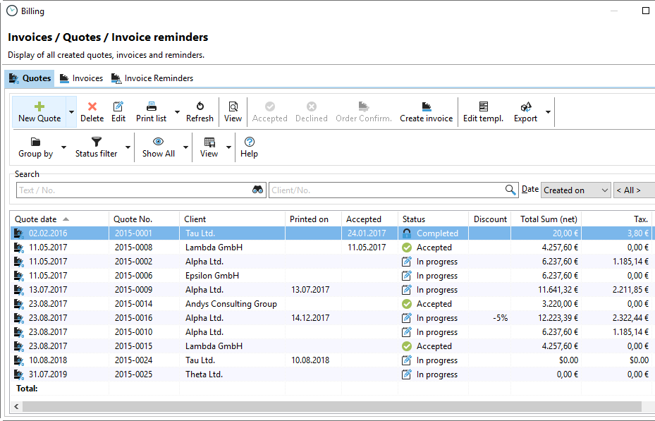 In quote management, you will see an overview of all quotes created in Xpert-Timer. The usual grouping and filtering options that are always available in the Xpert-Timer system are also available here.