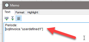 In the next step, insert a text field in the "Page 1" tab by clicking on the text field marker. Then click again on the place in your report where you want to display the user-defined field. Double-click the field so that you can enter data and enter [sqlInvoice."userdefined1"]. You can do this with all fields from 1 to 9. Press F9 to check your changes.