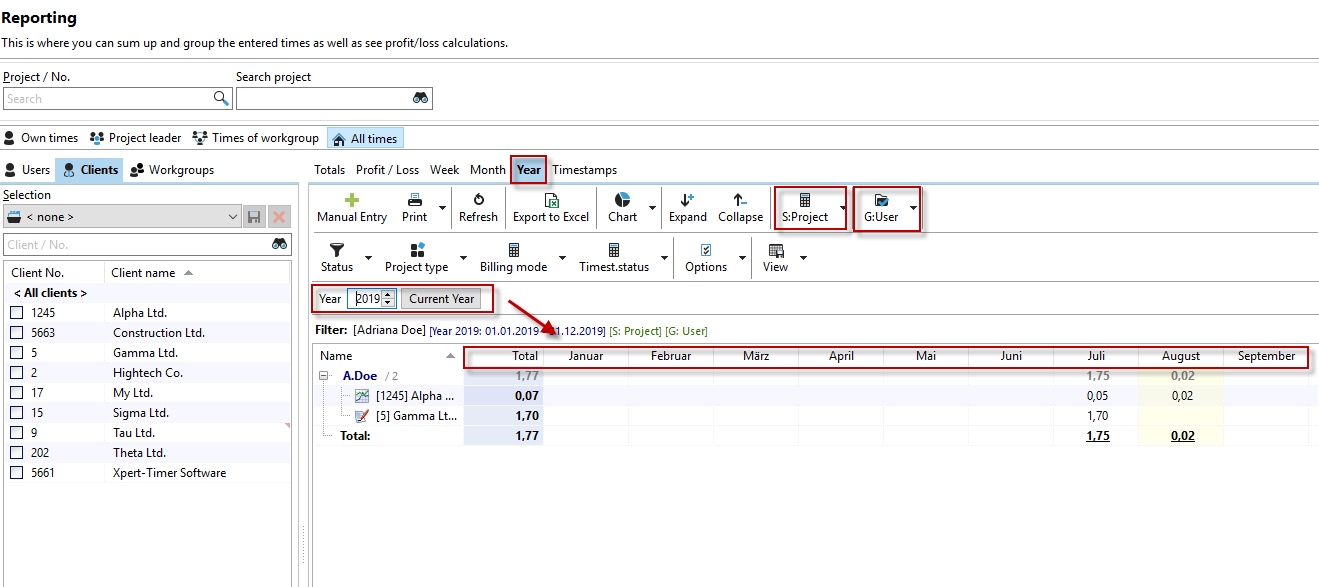 The annual view gives you a direct overview of the project times incurred per month throughout the year. The usual filters and grouping options are available. Summing by project and grouping by employee will be one of the most interesting combinations.