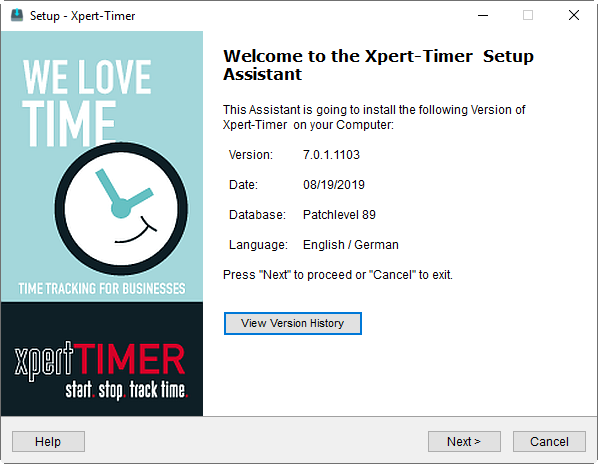 The installation wizard will start and display the version number and the current date. In the version history, you can see what changes have been made to the software over time.