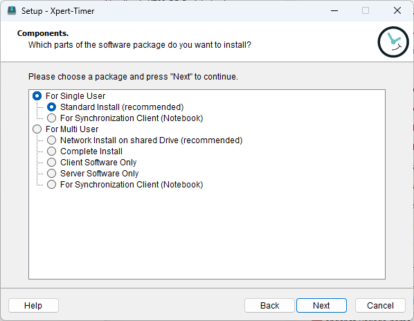 In the next step, select the scope of installation for the software. With the single-user/complete installation, an MS Access database will be automatically installed on your system, which Xpert-Timer uses to store data. If you are working alone on the Xpert-Timer system, this is the right choice.