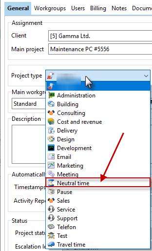 If you want to achieve complete recording of activities throughout the day, you can specify a so-called break and stop project in the configuration. This break or stop project serves only to fill gaps in time recording. The project should be seen as a "gap filler" for idle times. Automated functions such as the comment query are not intended for this purpose.