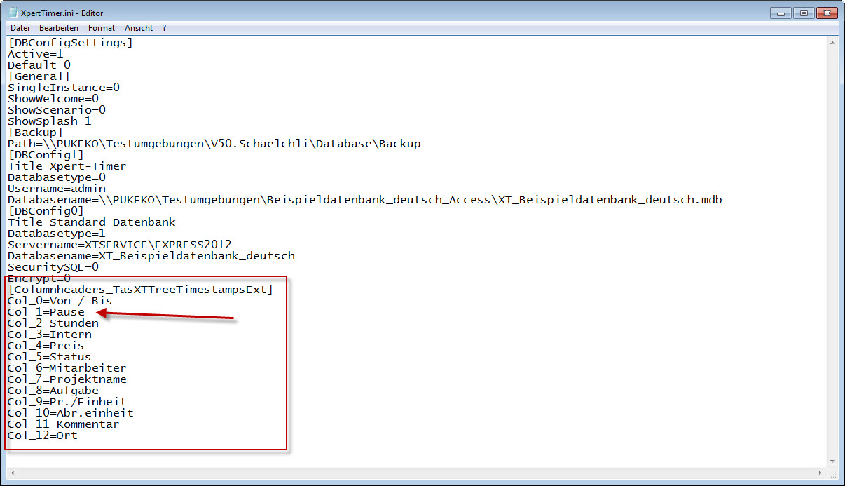 This function allows you to write the column headers of the selected list view to the "xperttimer.ini" file. This enables you to customize all or individual headers according to your needs. For example, you can rename the "Customer" column to "Client" or "Employee" to "Clerk." All changes apply to all lists of the same type.