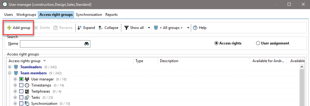 Create and assign access rights. You can create individual rights groups and assign them to the respective employee by checking the corresponding box. For example, a department head often has more rights than a clerk. If you create a new rights group here, you must assign the rights or access options it contains. This is done in the main dialog box of the employee management.