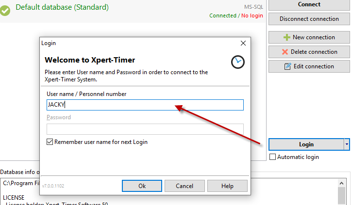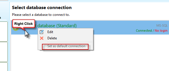 Only when you set the database connection as "Default" will Xpert-Timer access this database when it starts. You can set the database connection by right-clicking on the corresponding connection or by checking the "Default" box in the connection dialog: