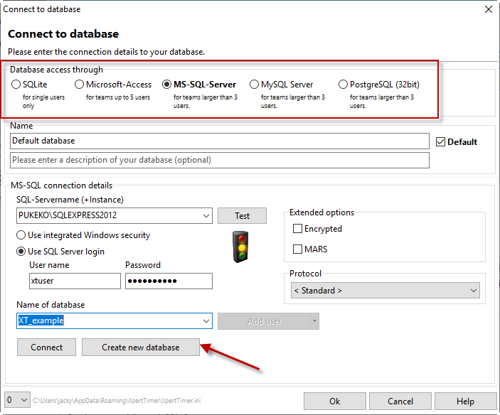 Use the "New Connection" button to establish a new database connection. Select "Create New Database" if there is no Xpert-Timer database on your system yet.