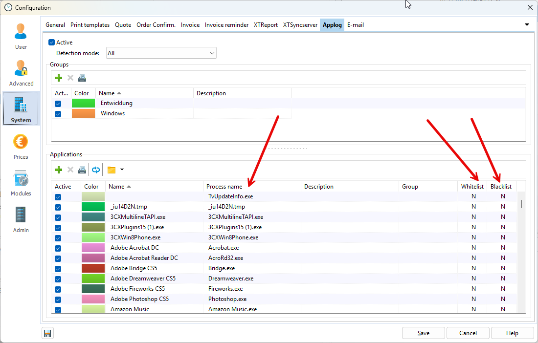 In the second step, the administrator decides which programs are placed on the whitelist or blacklist. Programs on the whitelist can be recorded, while programs on the blacklist are never recorded in the background.