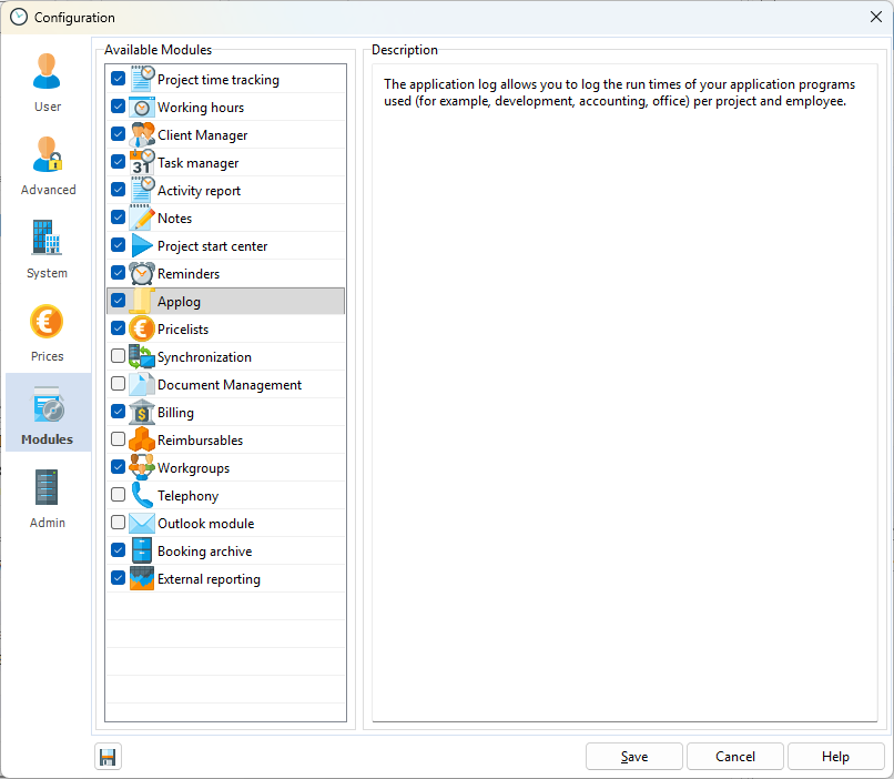 The application log records the duration of program use. This means that at the end of the month, you will know exactly how many hours you spent working in your email program, for example, or how many hours you spent in your accounting program or browser. Please note that the application log cannot recognize different applications within a browser. Online applications cannot therefore be recorded.