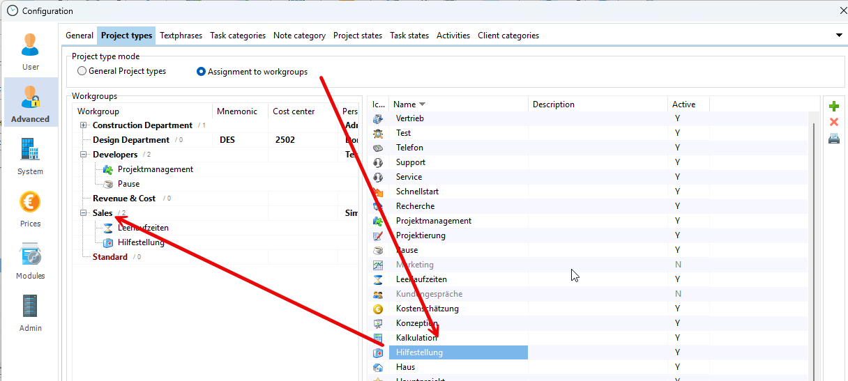 It is possible to assign project types to workgroups. This gives you a better overview when selecting project types.