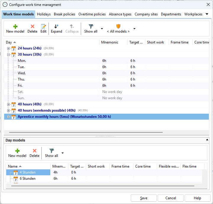 << Click to Display Table of Contents >> Navigation: Xpert-Timer Manual > Work time tracking > Manual > Configuration > Working Time Models |