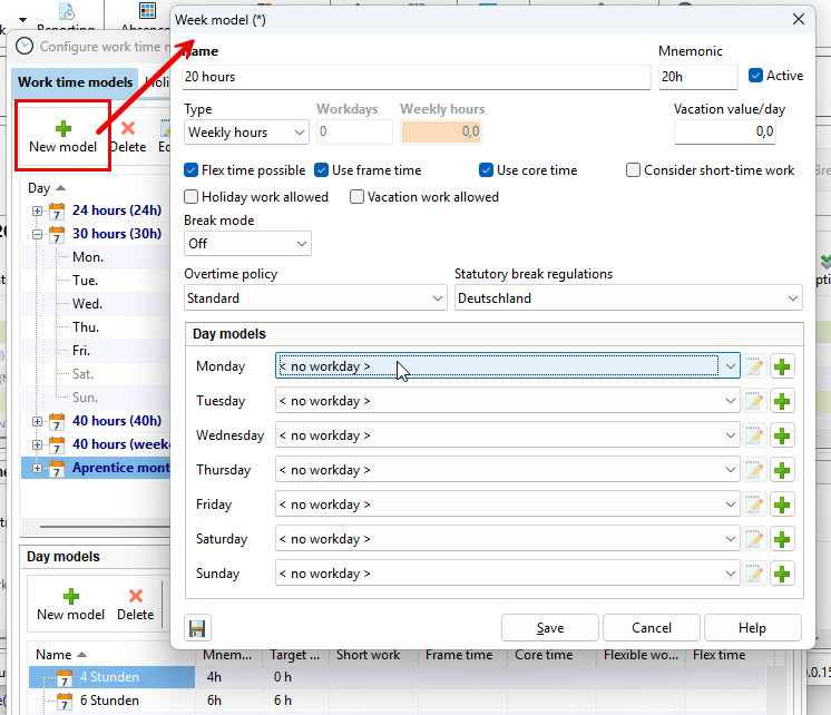 Use the menu item “New Model” to create a working time model.