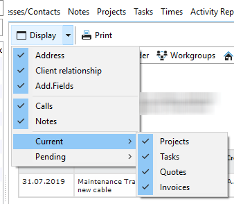 ➢ Address ➢ Customer relationship ➢ Additional fields ➢ Latest notes on the customer ➢ The latest projects, tasks, quotes, and invoices ➢ Open projects, tasks, quotes, and invoices |