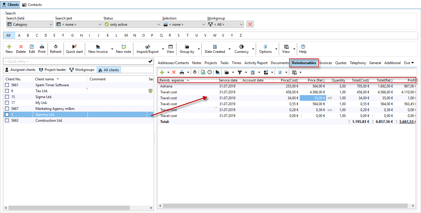 All services you have recorded for this customer during the project period are listed under the "Reimbursables" tab.
