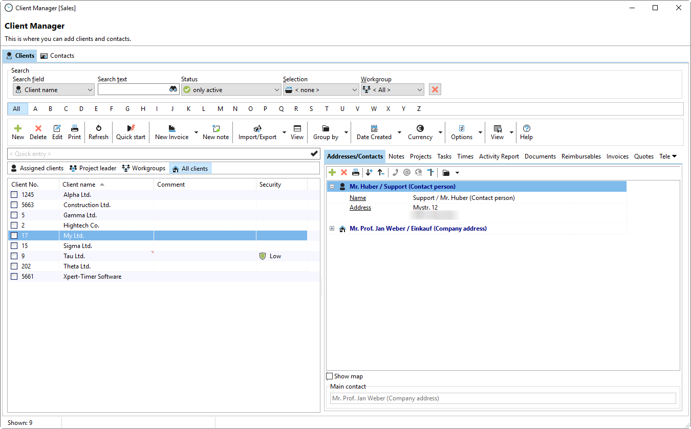 In customer management, you will see an overview of all your customers. Some details about the customer are also displayed directly. If you double-click on the customer, you will be taken to the "Customer" dialog, which allows you to change customer details or filter by specific criteria. Here you can also view invoices and enter additional information, such as the customer relationship. The tabs are identical for clients, so we will discuss the individual tabs in the Customer Data chapter.