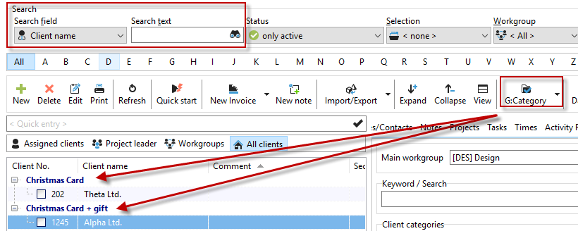 You can then use the grouping function and the "Category" selection or the search function to display the relevant customers with the selected category.