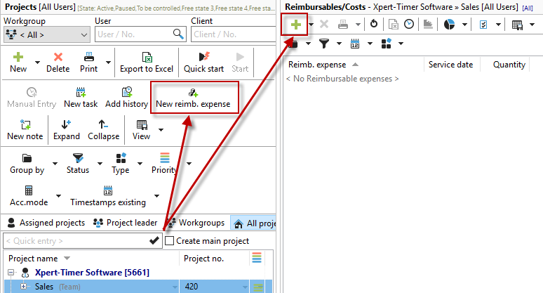 In the Project Manager, use the mouse to select the project for which you want to enter the reimbursable. If you have displayed your reimbursables in a separate window, you can also create a new reimbursable there: