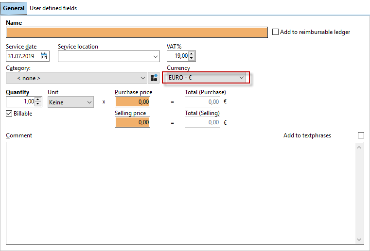 Under the "General" tab, you can also give the service to be entered an individual name, which you can add to the service catalog if you wish. You can then also display the name on the invoice.
