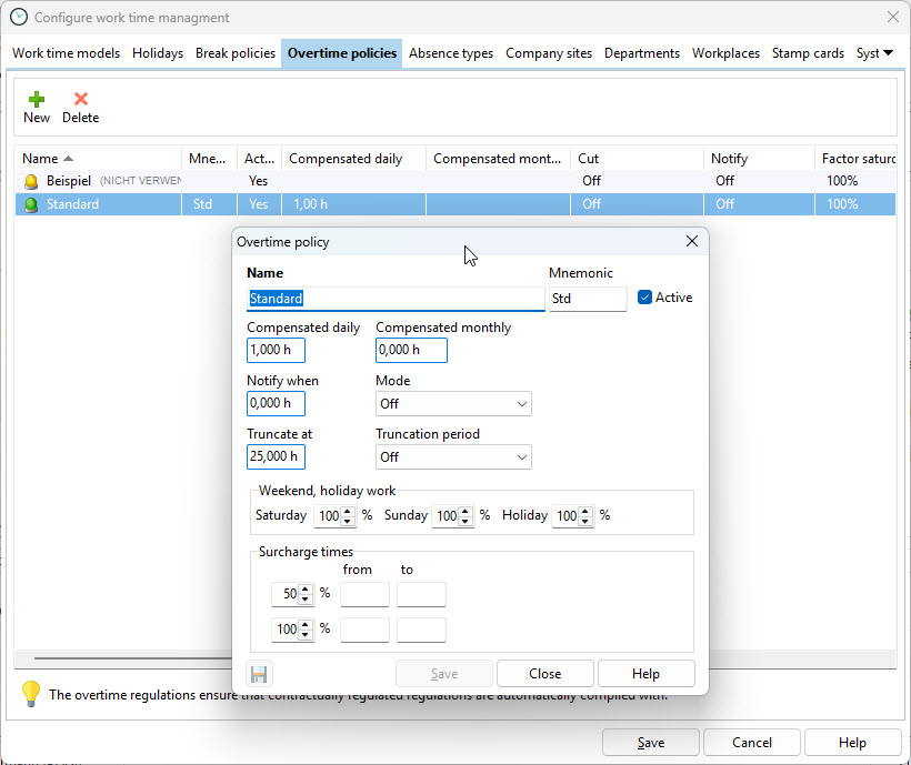 You can also define bonus rates and bonus periods for weekend and public holiday work. Recorded hours are then multiplied by the configured factors.