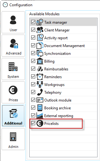 To use the price lists in your Xpert-Timer, you must activate the "Price lists" add-on module in the "Add-on modules" section of the configuration. Only then will all options for the price lists be visible in Xpert-Timer.