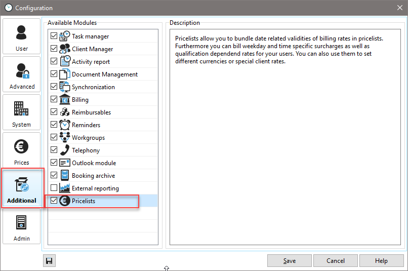 To activate the price lists, open the Xpert Timer configuration and activate the price lists in the "Additional Modules" area.