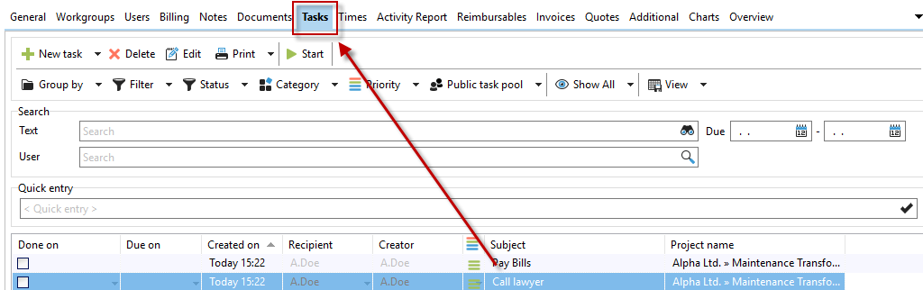 Under the "Tasks" tab, you can see the open tasks for the respective project. You can sort these by the respective headings. To do this, simply click on the heading with the mouse. A wide variety of filter functions are also available for your tasks.