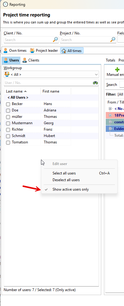 After a few years, some employees may have been set to "Inactive" status in order to release the corresponding license for another employee. To include these inactive employees in the reporting, you must display them in the list of employees. You can do this by right-clicking in the employee area.
