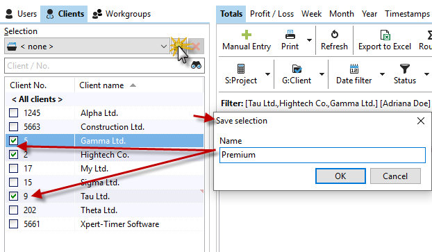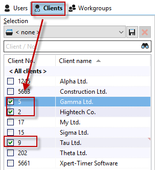 You can save these selected customers as a selection. To do this, select a few customers, then click on the "Save" button and assign a meaningful name. Your selection will then be available as a filter in the drop-down field.