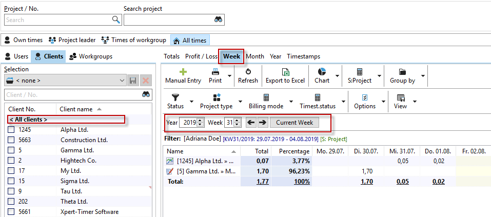 The weekly view gives you a direct overview of the project times accrued during the week. The usual filters and grouping options are available. Summing by project and grouping by employee will be one of the most interesting combinations.