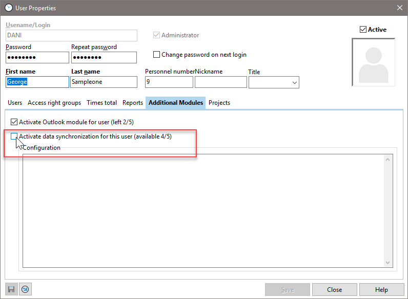 13.Under the menu item "Window" --> "Employees" or "Edit" -> User Settings (in the single-user version), you must assign the synchronization module to the individual users. In the single-user version, you will find the "Additional Modules" tab under Edit -> User Settings.