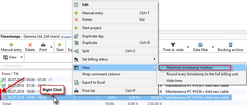 You can display the overlap markers maximized as in our example, or only as a small block to the left of the project type. You can set the overlap marker by right-clicking on a timestamp: