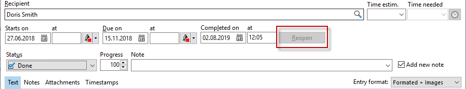 Completed tasks can also be reopened later. To do this, select the relevant task, click on "Edit" and use the "Reopen" button.