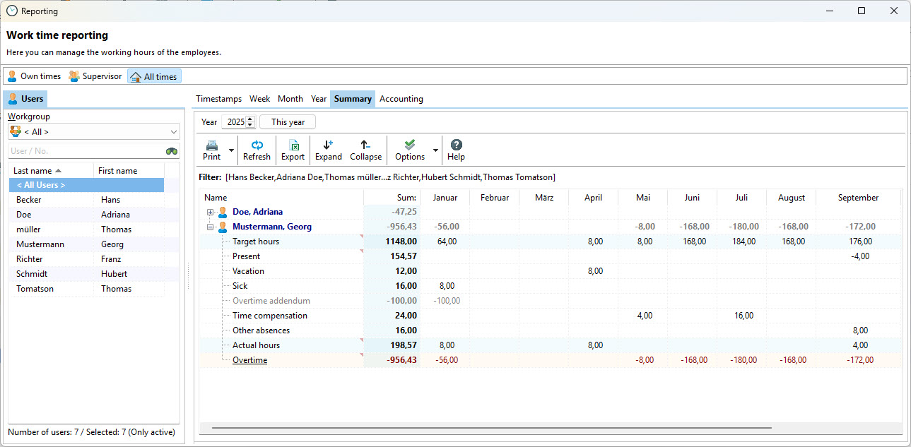 The working time reports provide detailed information about individual time stamps for each employee. You can analyze these entries and, if you have the required permissions, edit them. Every change is logged in the database.