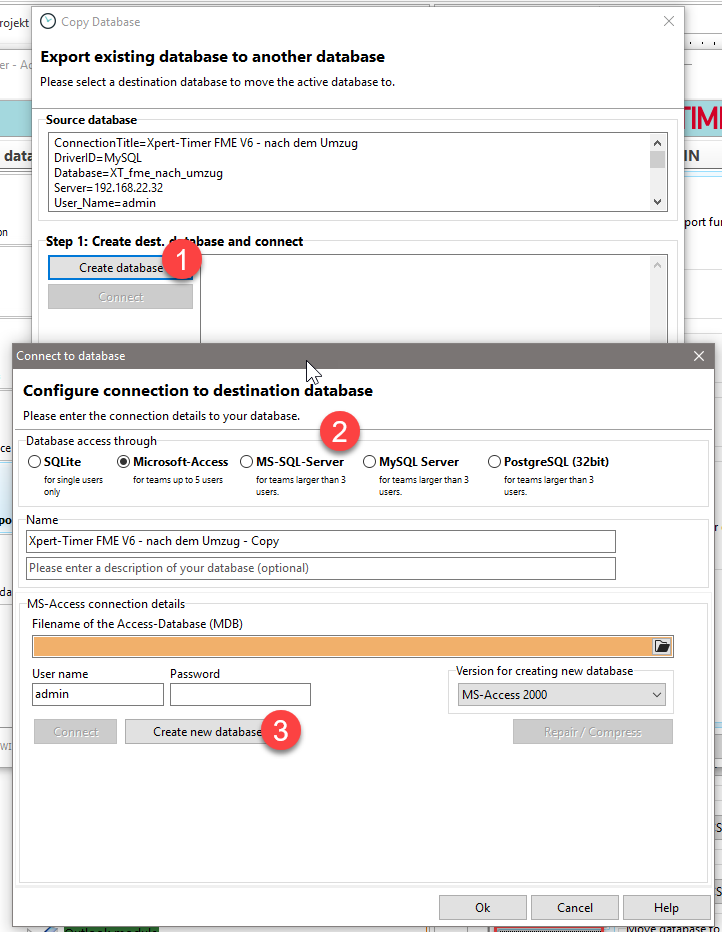 You have already selected your source database. Now select the target database or create a new, empty database. All data to be transferred will then be listed in step two.