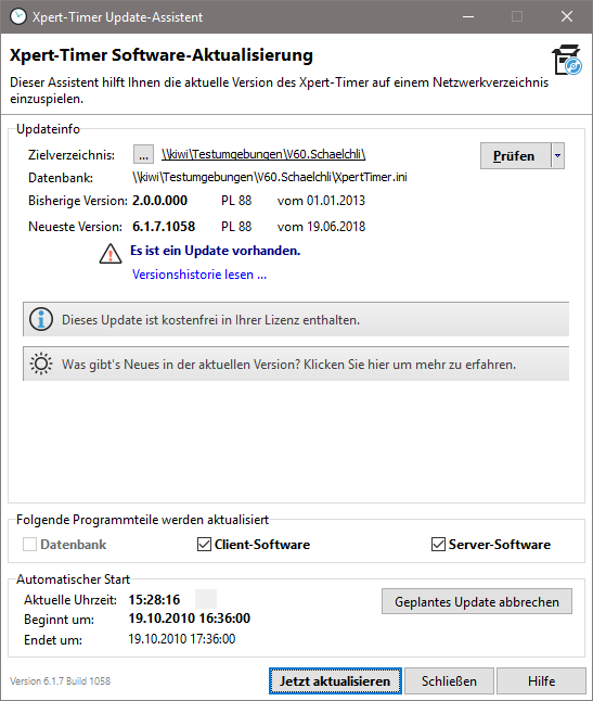 In the first step, select the date and time when you want to install the update. Select the program components to be updated and the paths where you want to install the update. Please note that the paths must not contain any spaces.